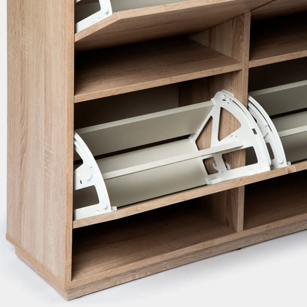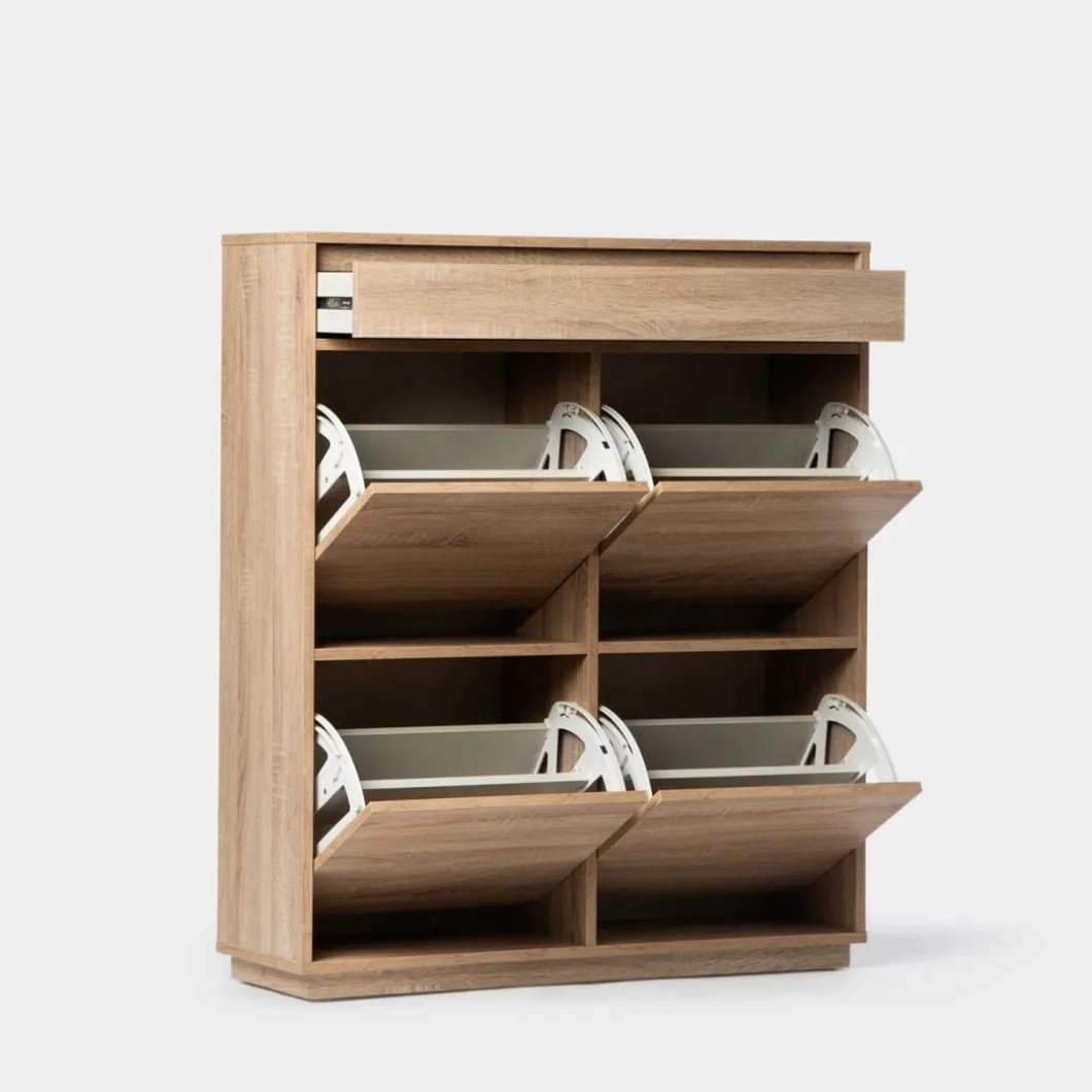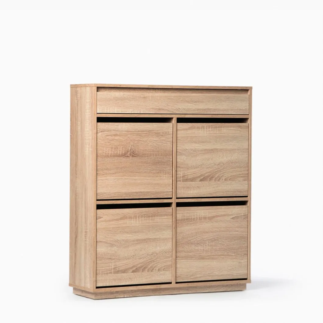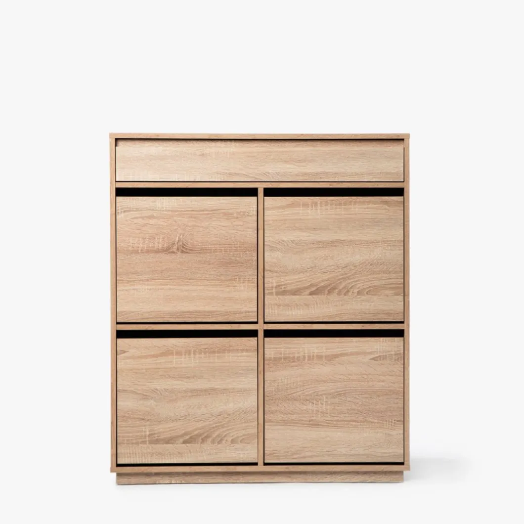 El zapatero Oslo es la solución perfecta para mantener tus zapatos organizados con estilo. Su diseño compacto lo convierte en la opción ideal para pasillos, entradas o dormitorios. Equipado con 4 puertas y un cajón en la parte superior, este versátil mueble tiene capacidad para almacenar hasta 16 pares de zapatos. Cada compartimento cuenta con separadores ajustables y/o extraíbles, permitiéndote adaptarlo fácilmente para botas u otros calzados voluminosos. Para garantizar su estabilidad, se recomienda fijarlo a la pared.
