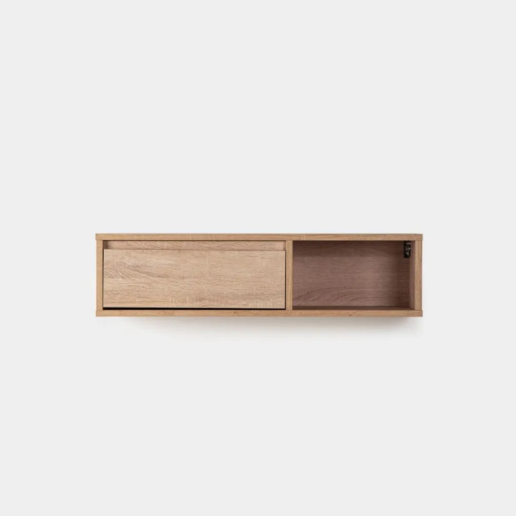El mueble recibidor flotante Oslo es de diseño propio y su estilo predominante es el nórdico, pero debido a sus líneas simples y geométricas se puede integrar en cualquier espacio. Dispone de un cajón dónde guardar aquello que desees, como las llaves o la correspondencia y en estante. Por su reducido tamañao es ideal para recibidores y entradas pequeñas. Para mayor estabilidad del mueble, aconsejamos su anclaje a la pared.
