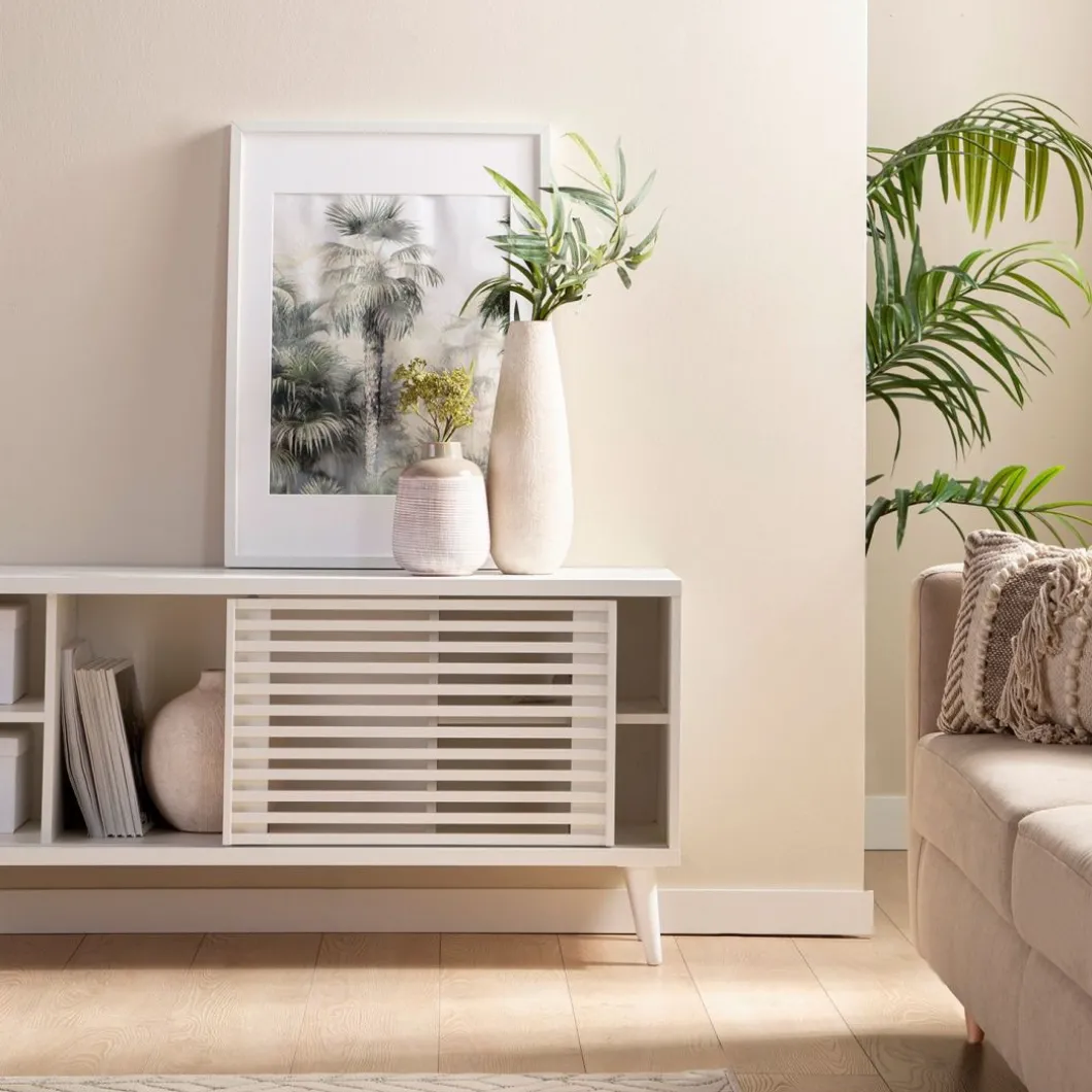 El mueble tv Palm es una pieza que respira tendencia. Además de bonito , este tv de puertas correderas es muy práctico ya que dispone de suficiente espacio para que tengas todo bien organizado. Lo encuentras disponible en dos acabados y en dos medidas de manera que te será sencillo escoger el que más se ajuste a tus necesidades. Si quieres dar un toque nórdico a tu salón este mueble es perfecto.