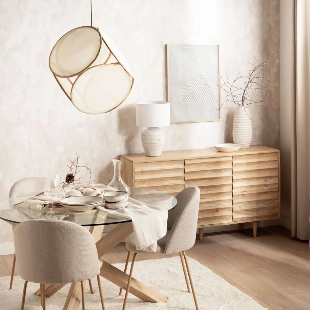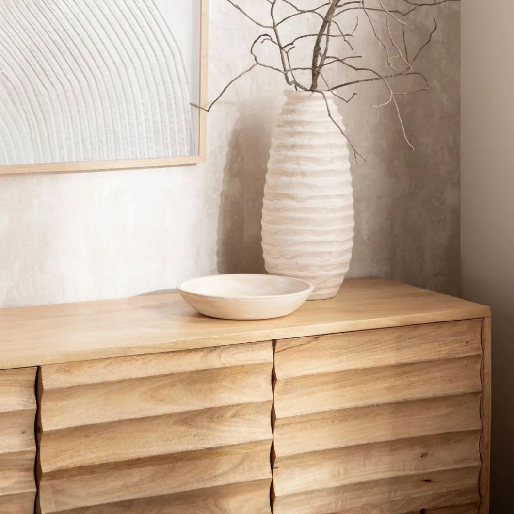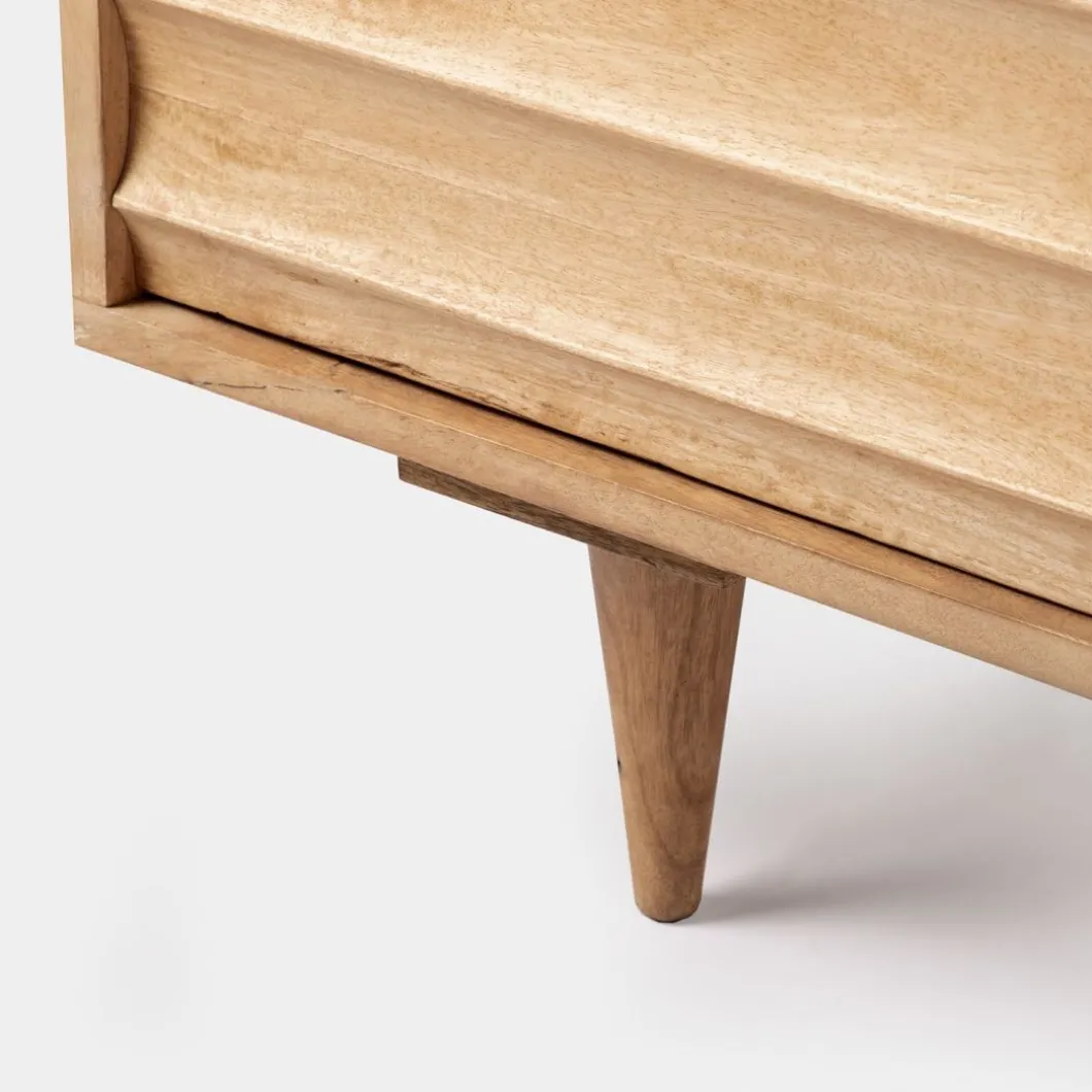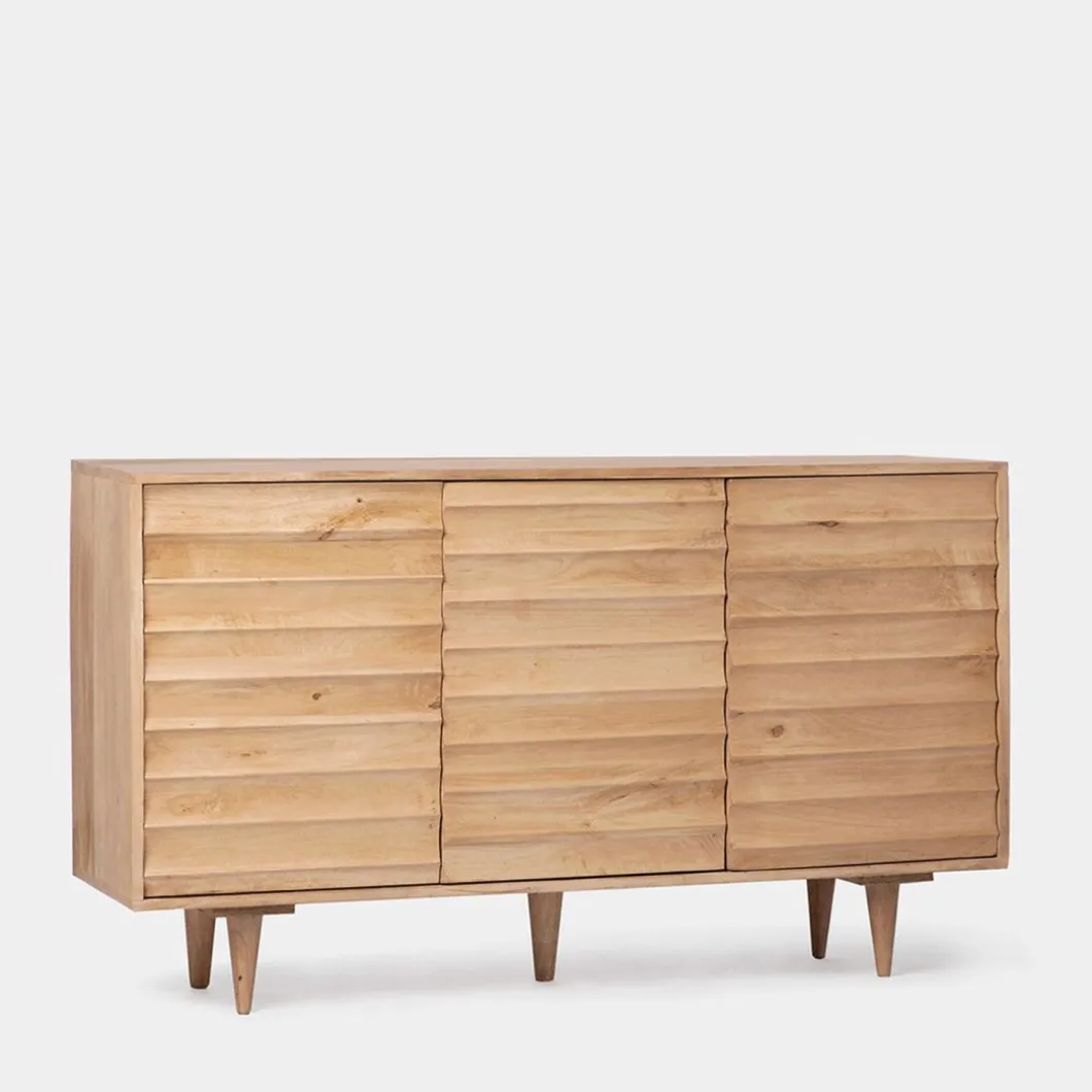 El aparador en madera de mango Sama derrocha estilo y personalidad. Sus tres puertas han sido talladas a mano por maestros artesanos, por lo que se trata de una pieza única. Cuenta con un sistema de apertura push que permite abrir y cerrar el conjunto fácilmente, aunque si lo prefieres puedes utilizar el uñero. Para mayor estabilidad del mueble, aconsejamos su anclaje a la pared. Consigue el look completo combinándolo con el mueble TV de la misma colección.