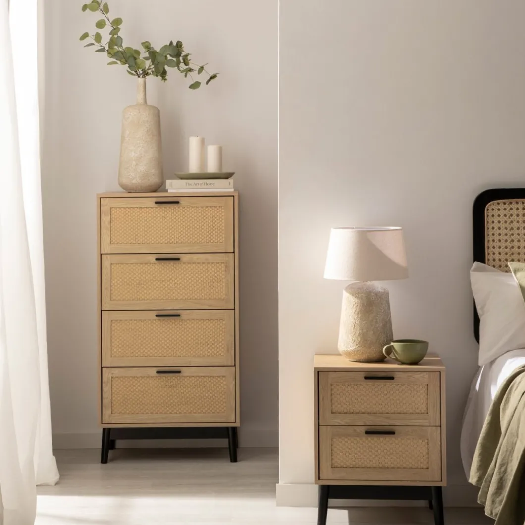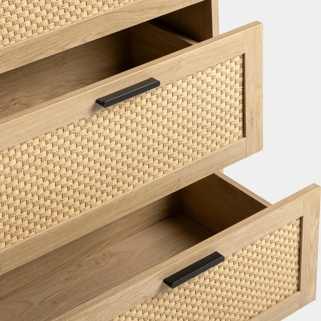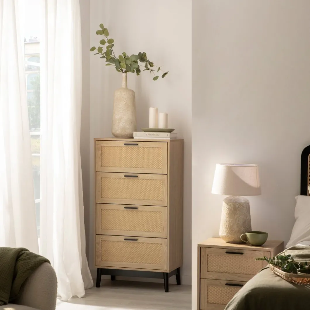 Transforma tu dormitorio en un espacio acogedor y con estilo con el sinfonier Samoa en madera color natural y fibra natural. Con cuatro amplios cajones, esta pieza ofrece un generoso espacio de almacenamiento para ropa, accesorios y objetos personales. Ideal para quienes buscan una pieza versátil y atemporal que complemente la decoración de su hogar.
