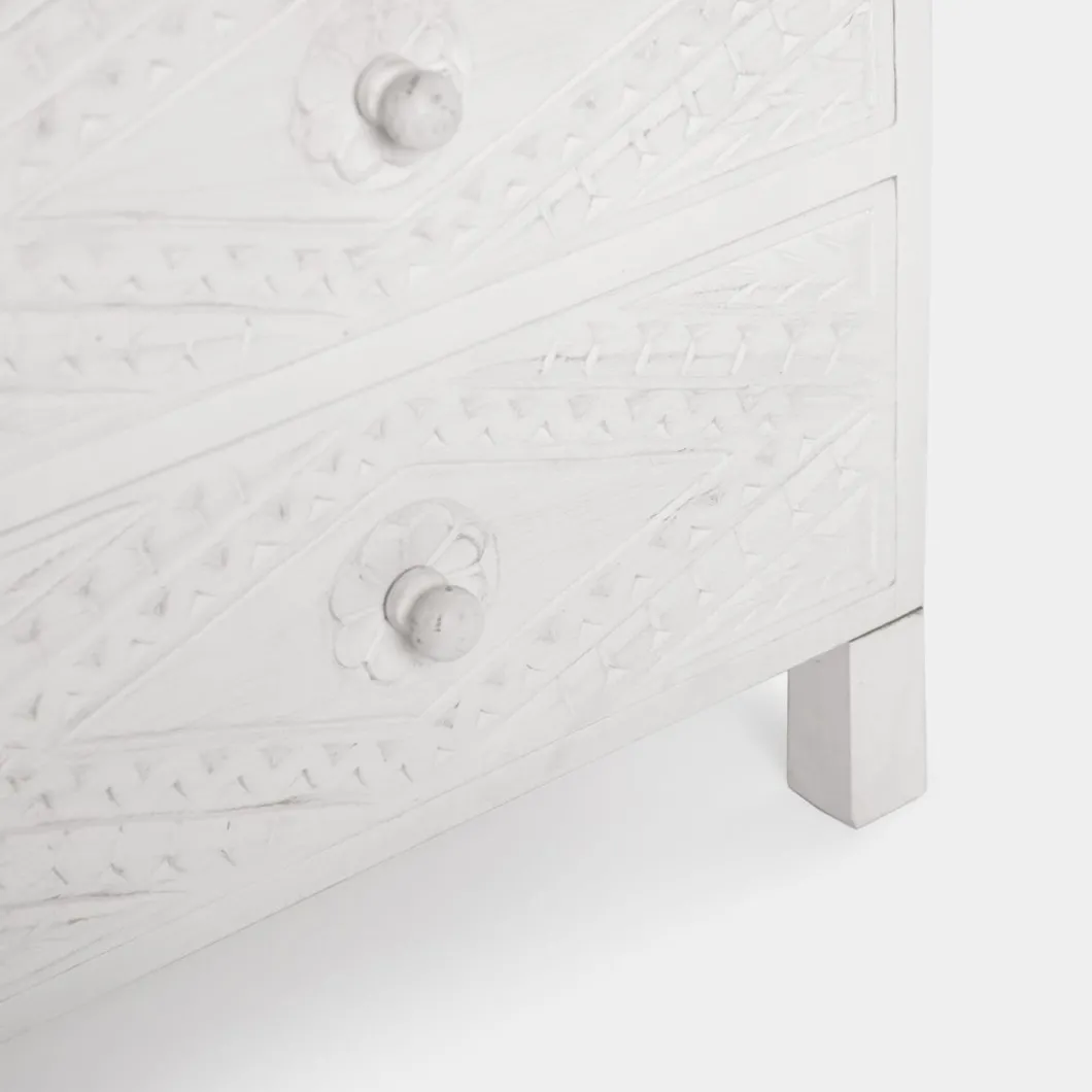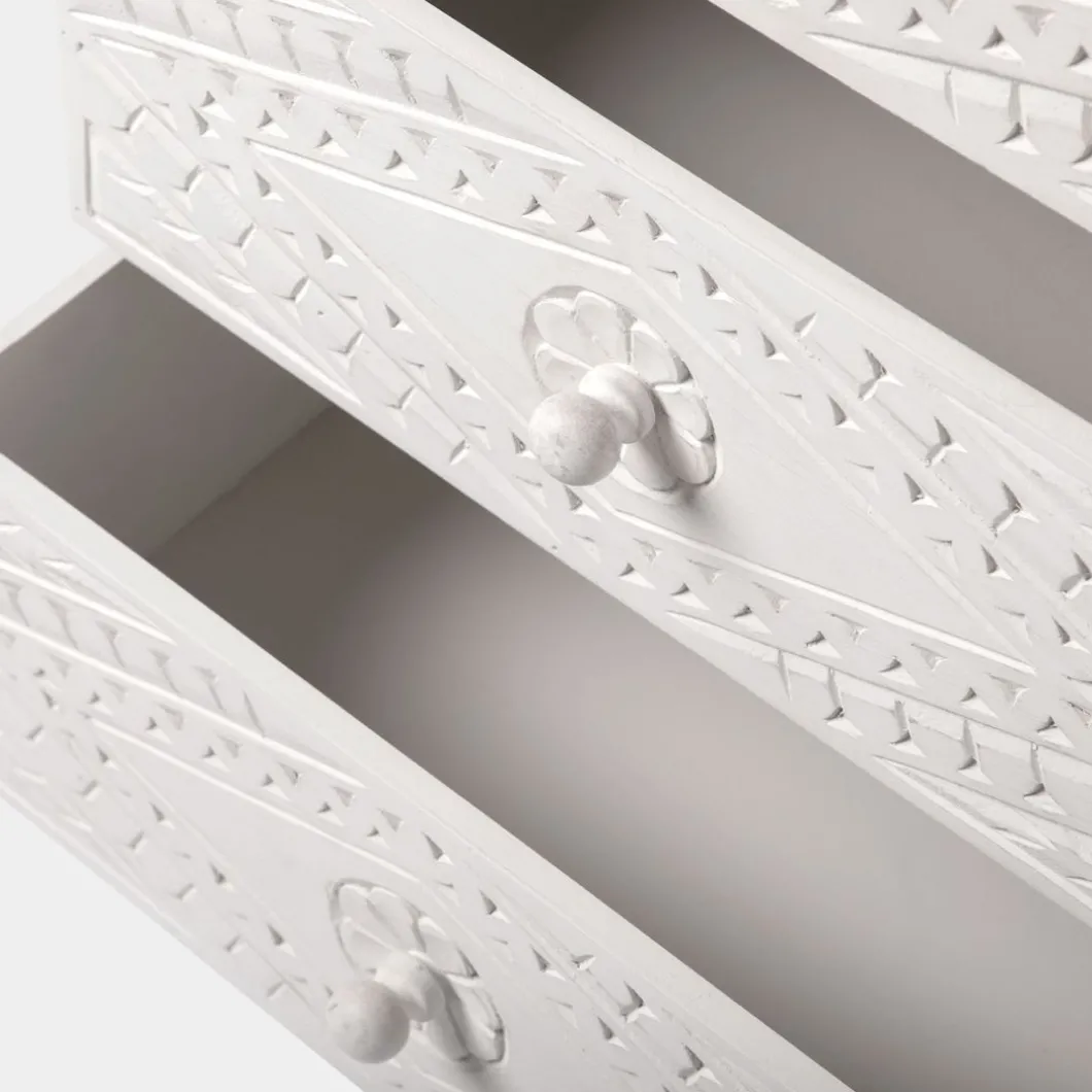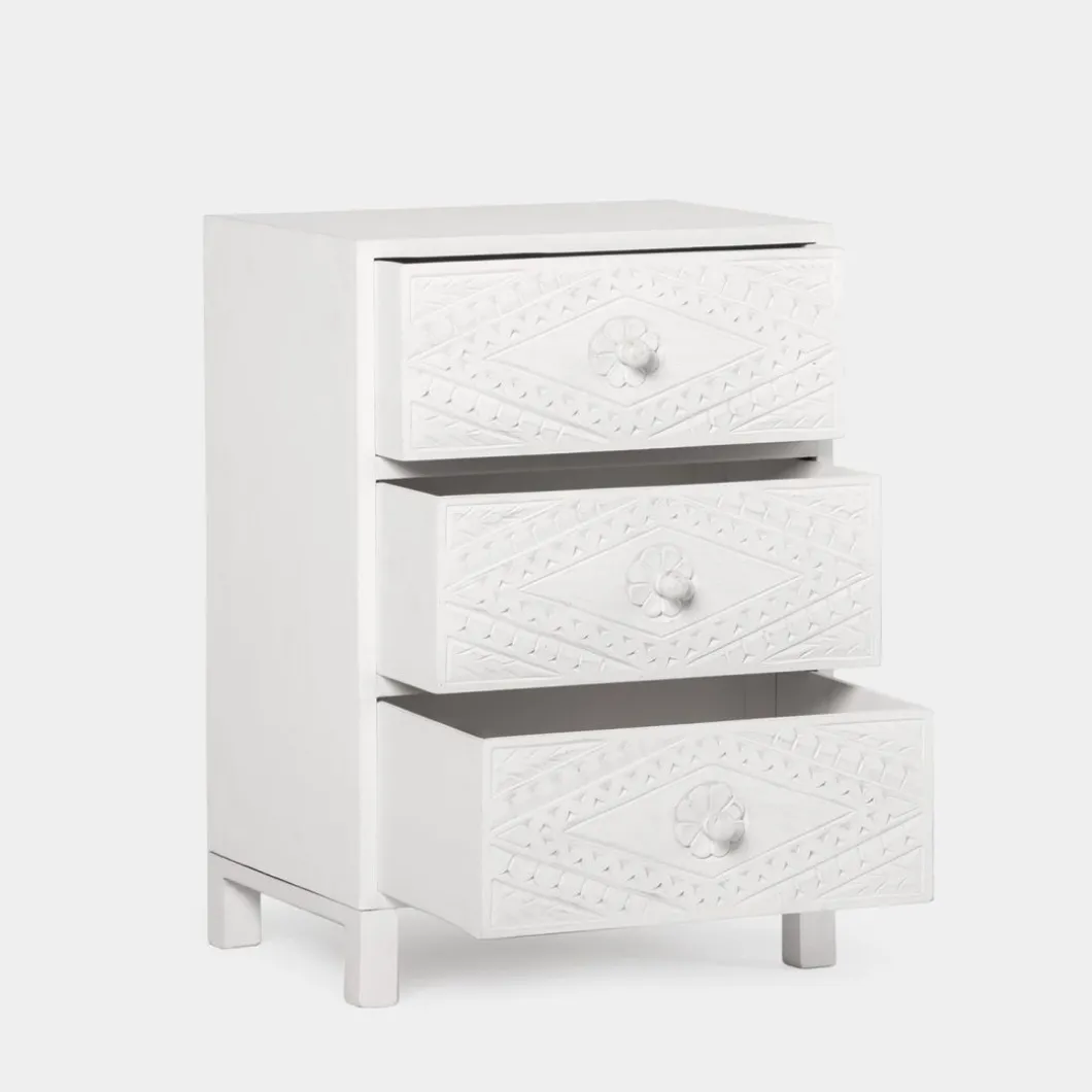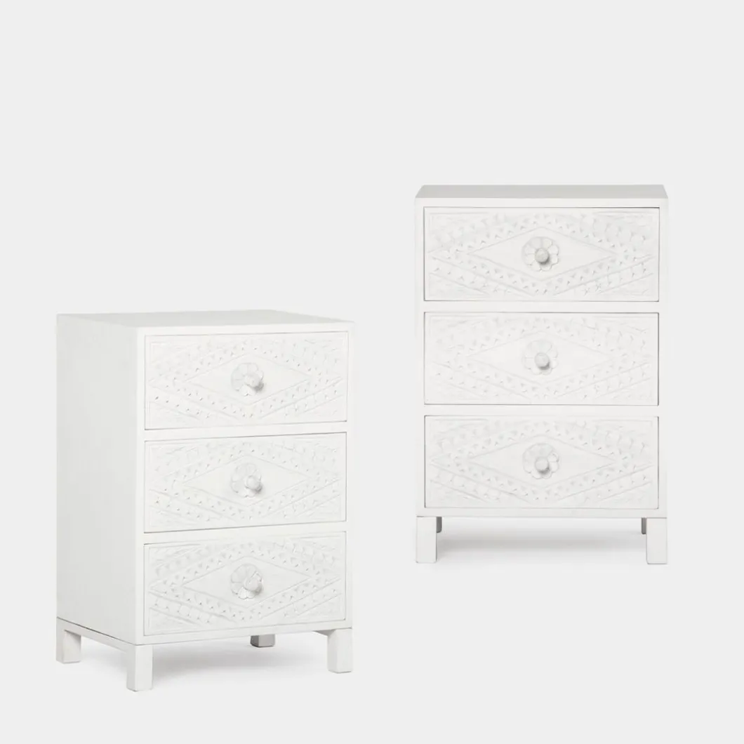 ¡Aprovéchate de este pack de 2 mesitas! La mesita de noche de 3 cajones en blanco vintage Sinta es el mueble auxiliar ideal para completar la decoración de tu dormitorio. Sus 3 amplios cajones darán un extra de almacenamiento a tu hogar. Ha sido fabricada a mano por maestros artesanos, por lo que cada pieza es única.