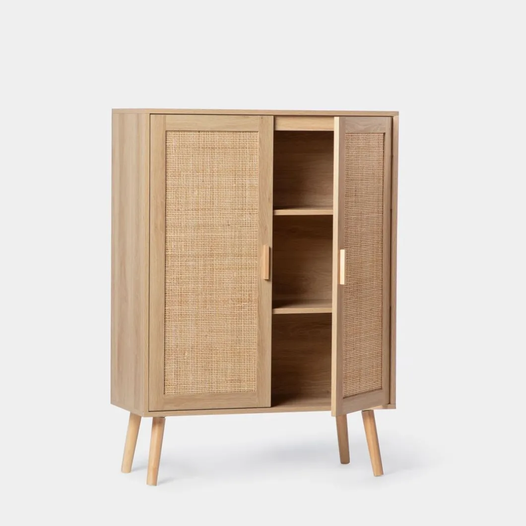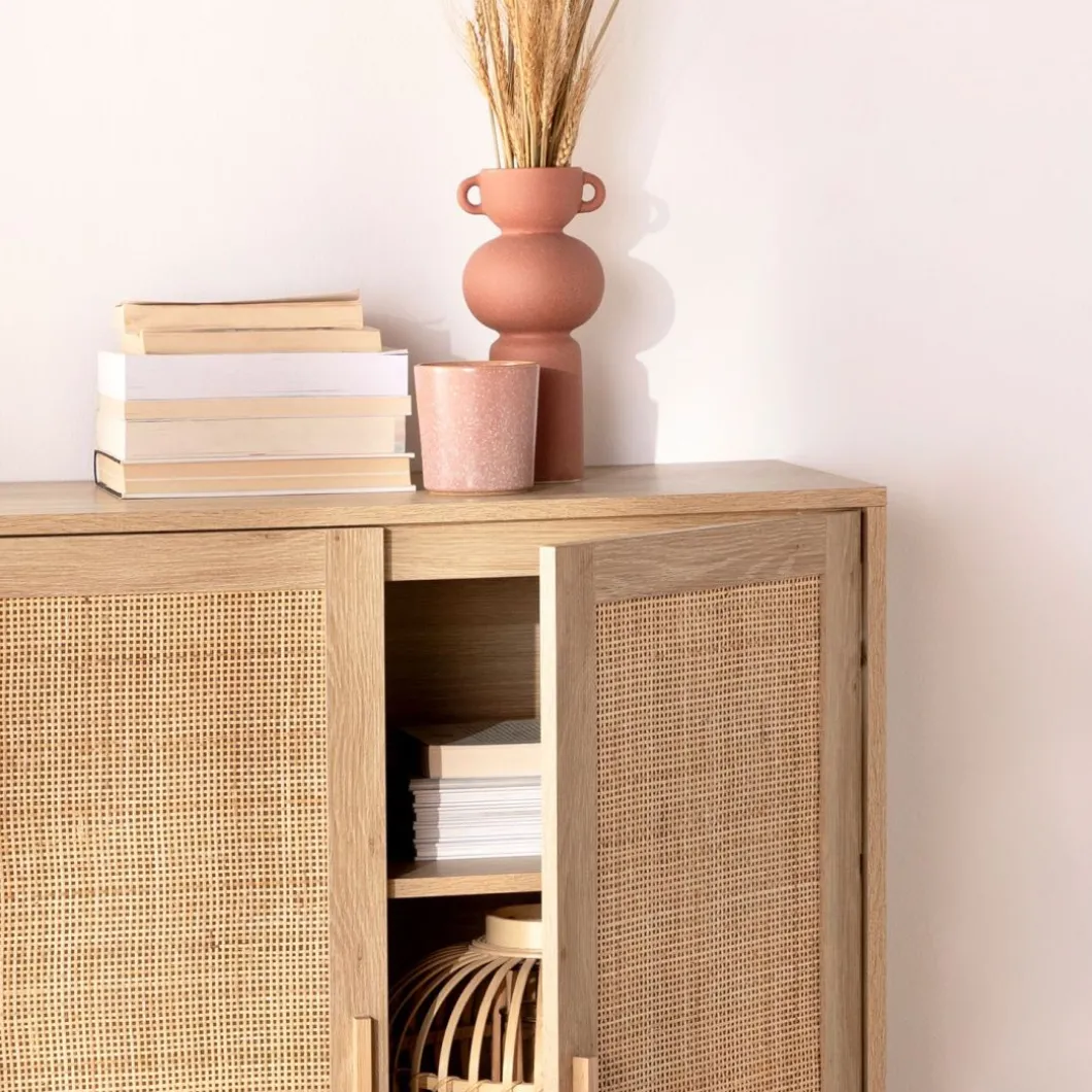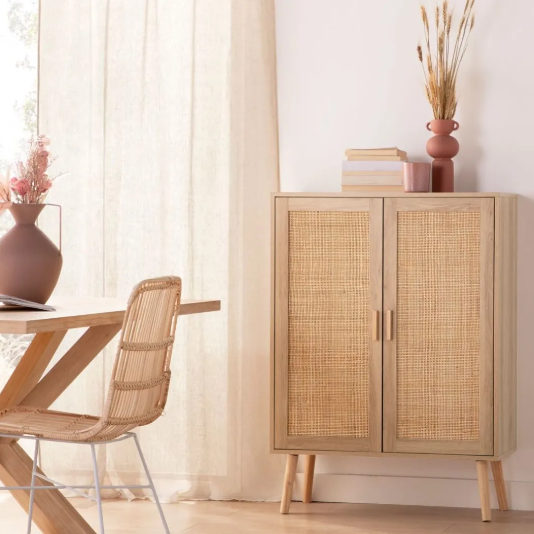 La vitrina en ratán natural Tahiti aportará un toque acogedor a tu recibidor, dormitorio o salón. Cuenta con dos puertas y tres estantes en los que podrás organizar tu vajilla, documentos o incluso ropa de hogar. Combínalo con el resto de muebles de la colección y ¡consigue un efecto wow!