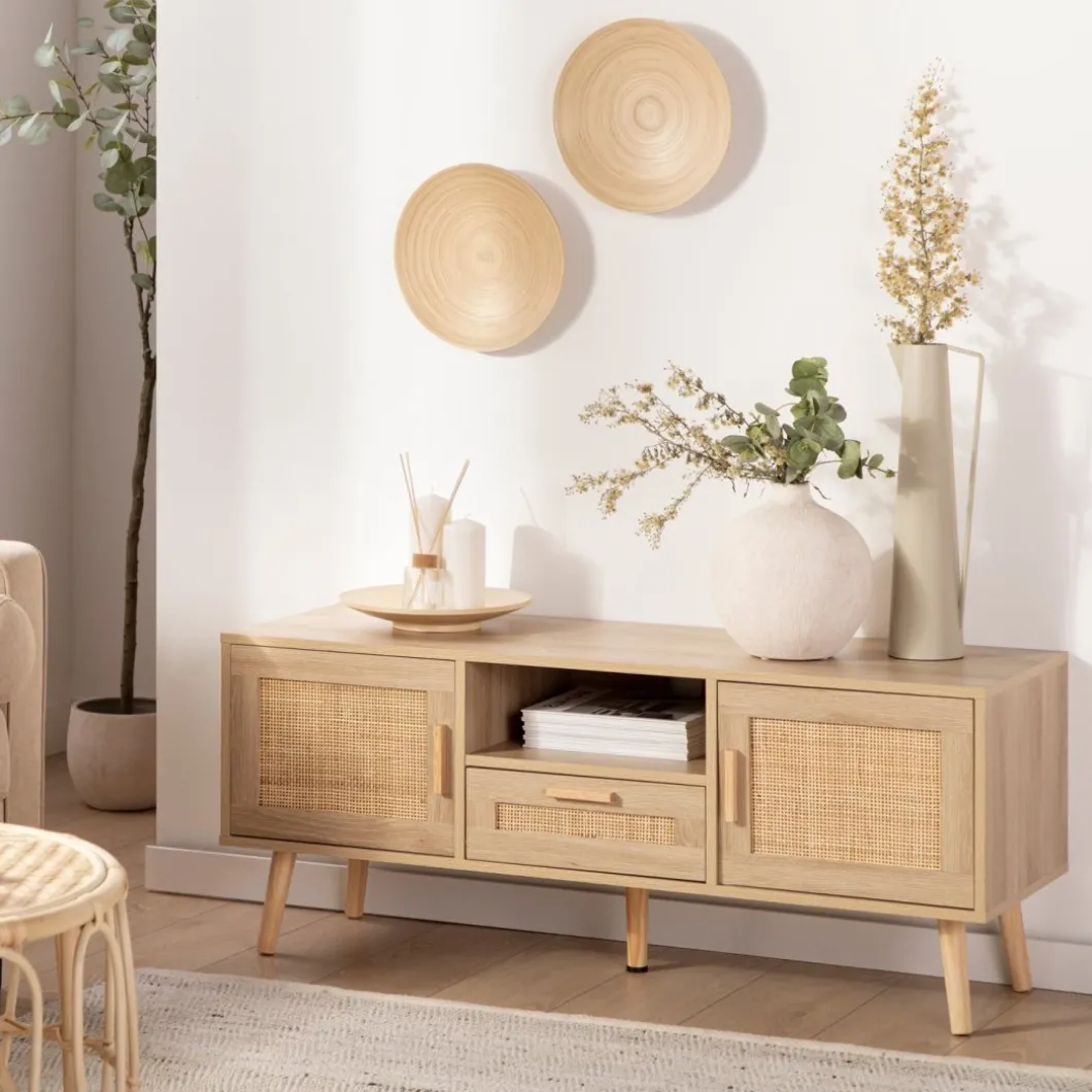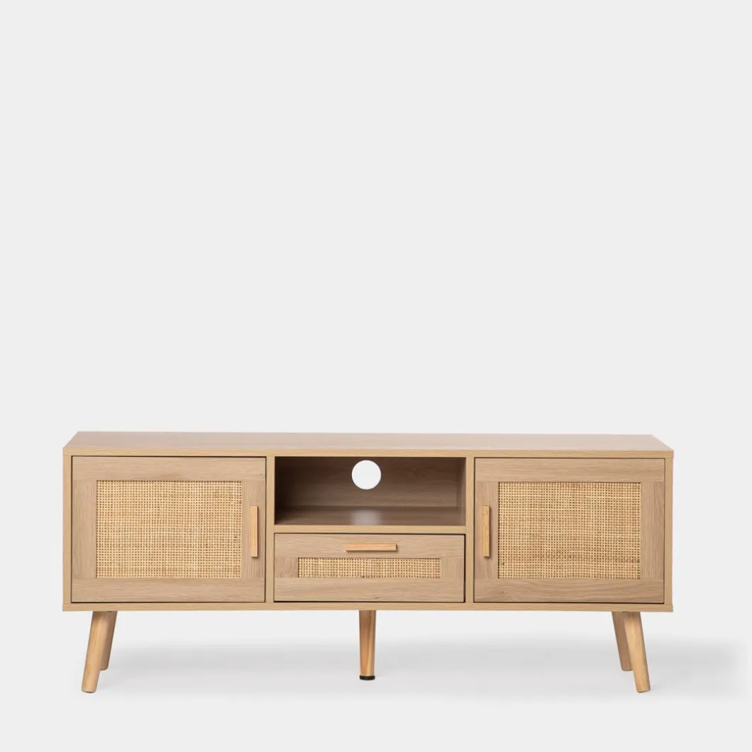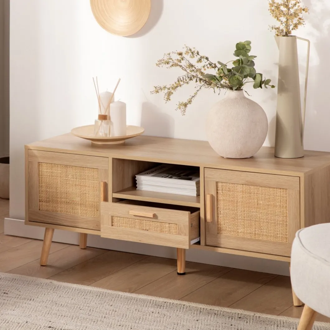 Con el mueble TV de 120 en ratán natural Tahiti conseguirás darle un toque natural y vintage a tu salón/comedor. Cuenta con dos puertas, un cajón y un estante en el que podrás almacenar todos tus accesorios multimedia y mantener el orden en tu hogar. Combínalo con los muebles de la misma colección y crea espacios con encanto.