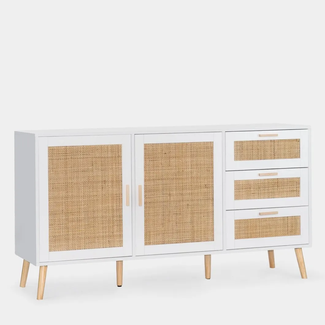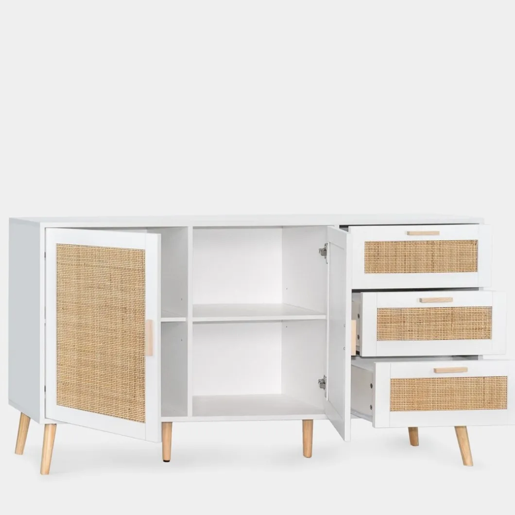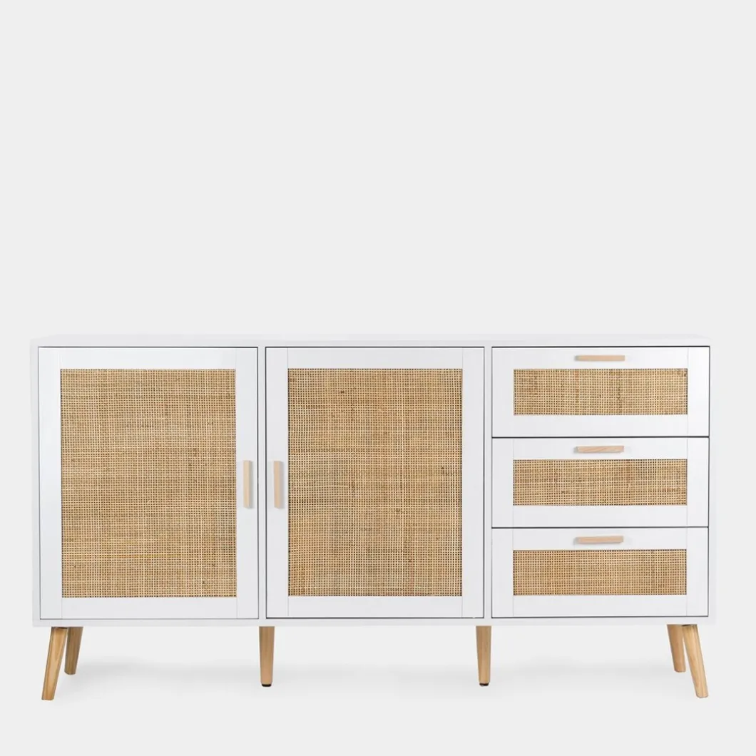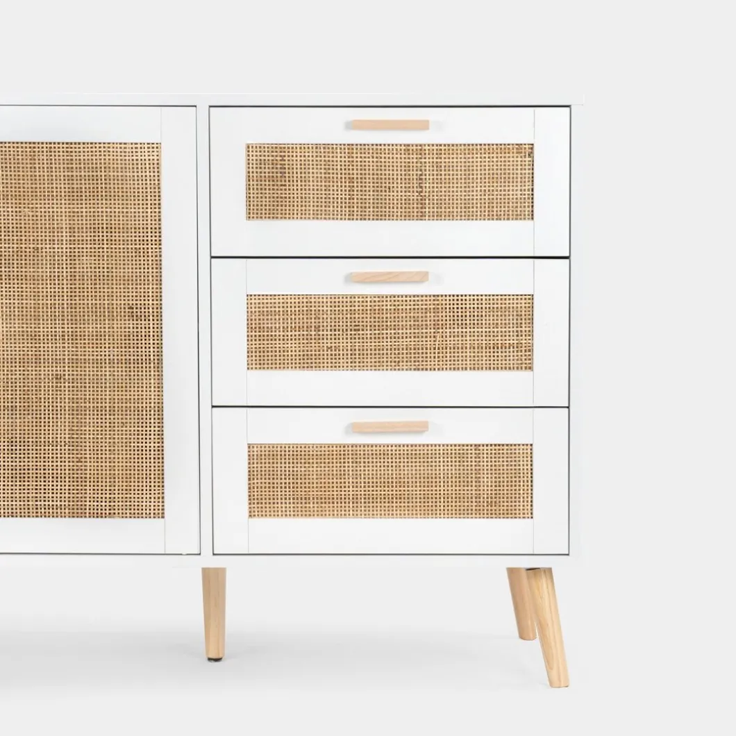 Consigue un plus de almacenamiento y estilo con el aparador en ratán natural Tahiti. Cuenta con dos puertas y tres cajones que permiten optimizar al máximo el espacio y mantener el orden. Para mayor estabilidad del mueble, aconsejamos su anclaje a la pared. Combínalo con otras piezas de la colección y ¡consigue un efecto wow!