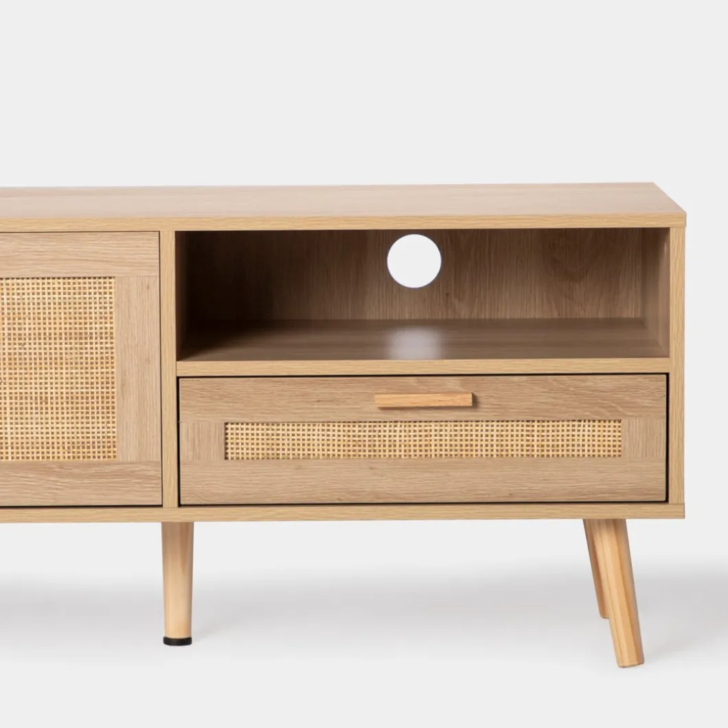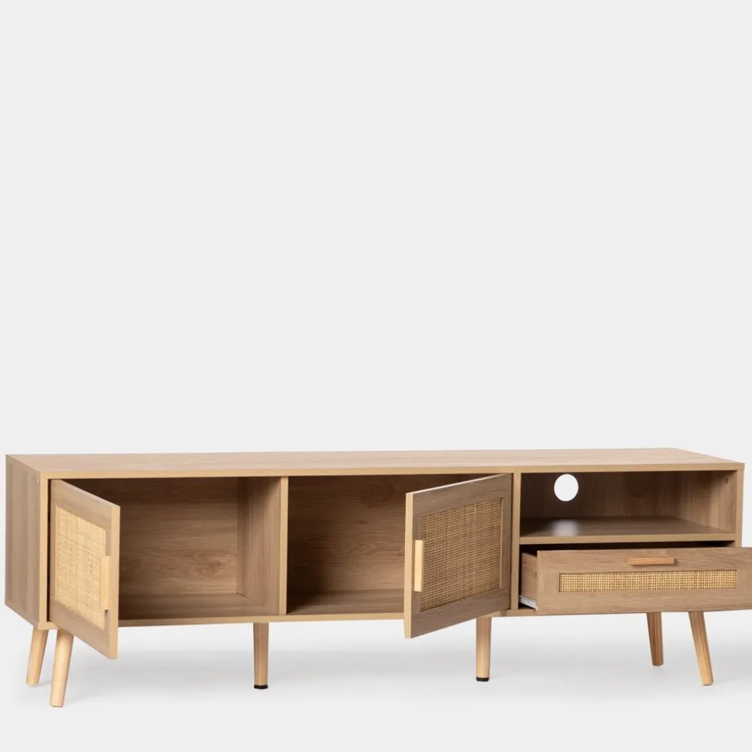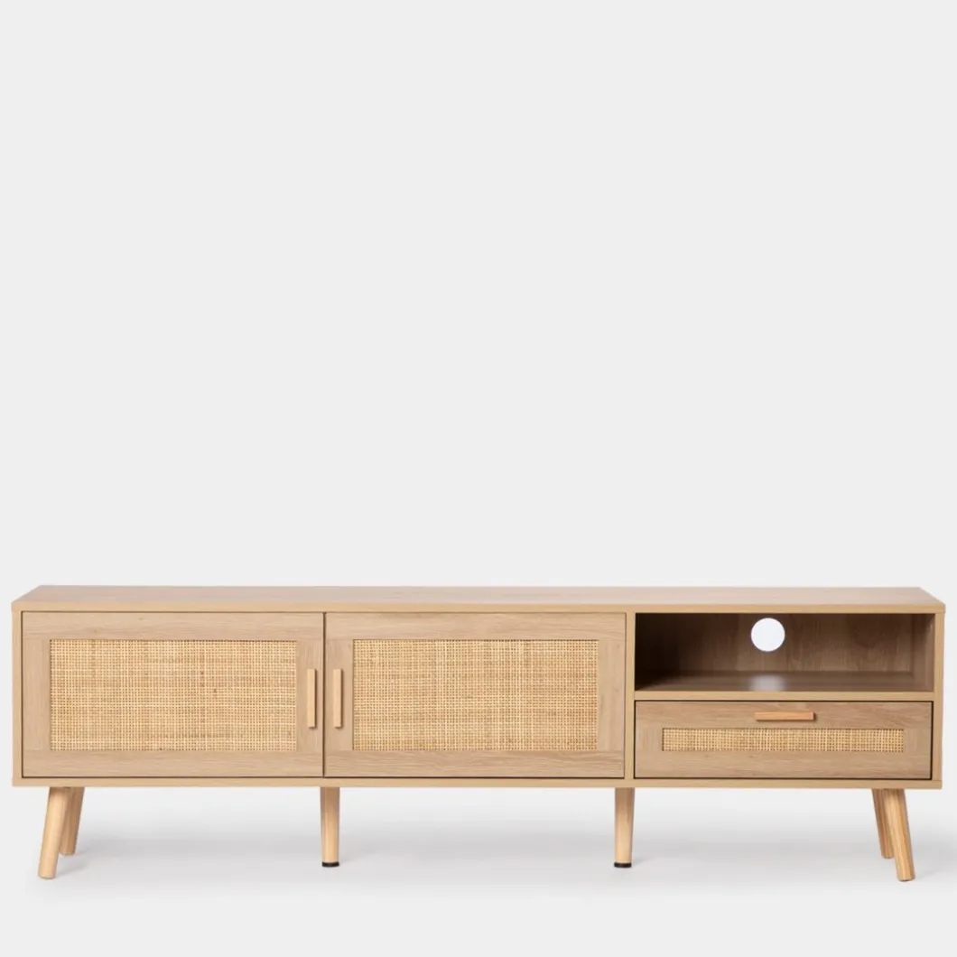 Con el mueble TV de 160 en ratán natural conseguirás darle un toque natural y vintage a tu salón/comedor. Cuenta con dos puertas, un cajón y un estante en el que podrás almacenar todos tus accesorios multimedia y mantener el orden en tu hogar. Combínalo con muebles de la misma colección y crea espacios con encanto.