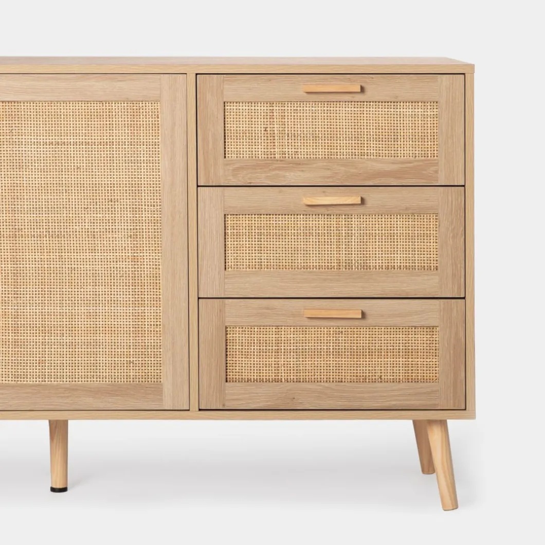 Consigue un plus de almacenamiento y estilo con el aparador en ratán natural Tahiti. Cuenta con dos puertas y tres cajones que permiten optimizar al máximo el espacio y mantener el orden. Para mayor estabilidad del mueble, aconsejamos su anclaje a la pared. Combínalo con otras piezas de la colección y ¡consigue un efecto wow!