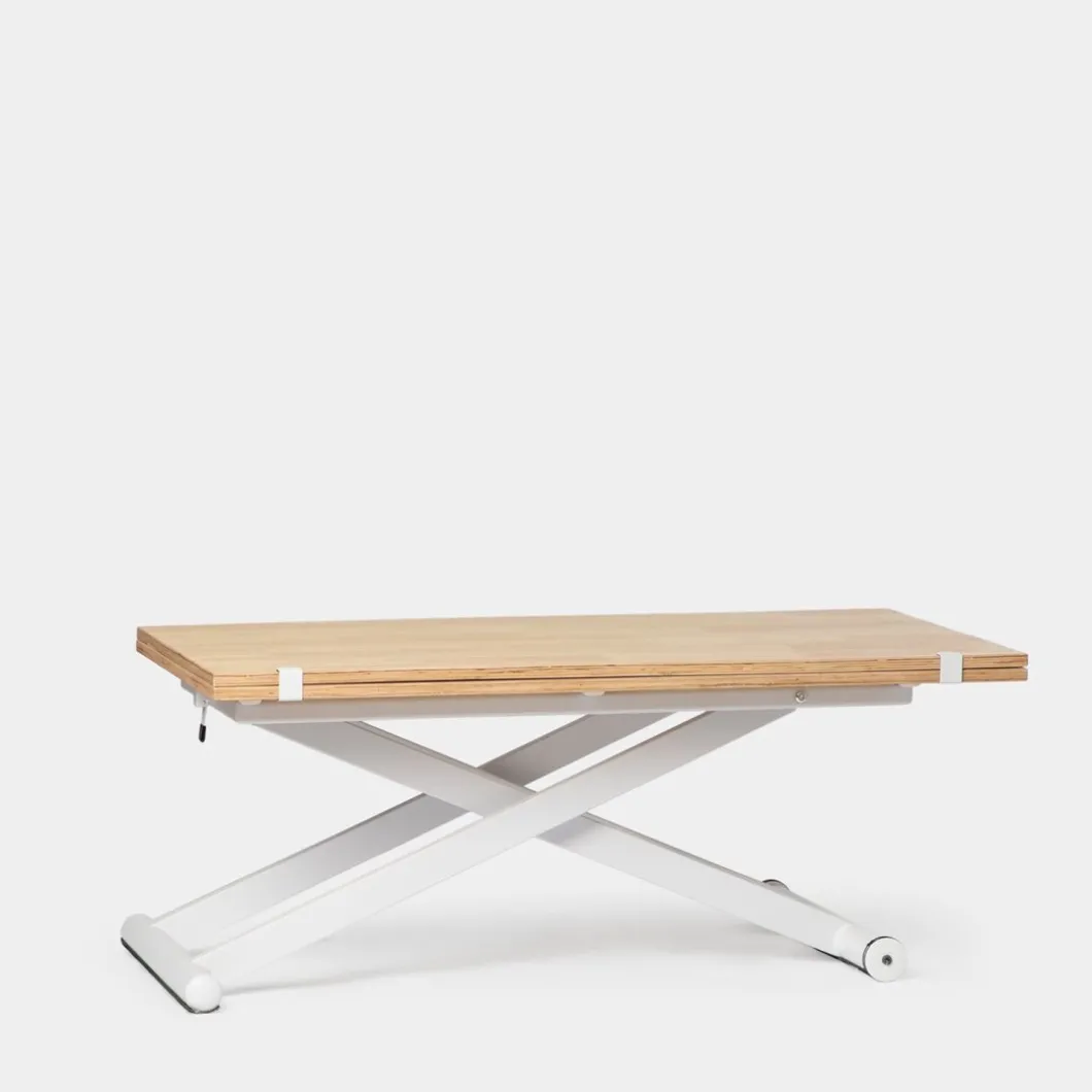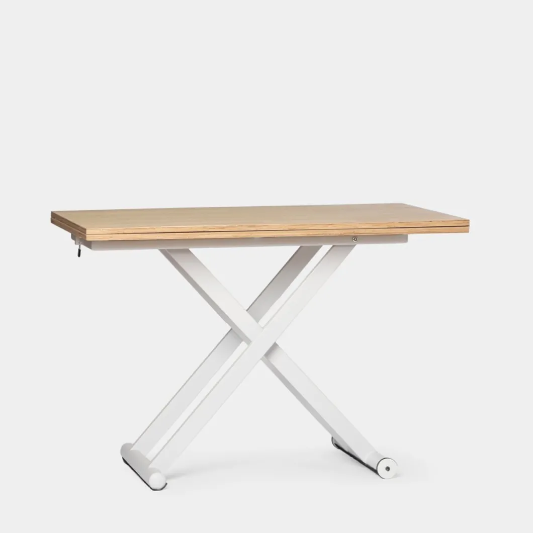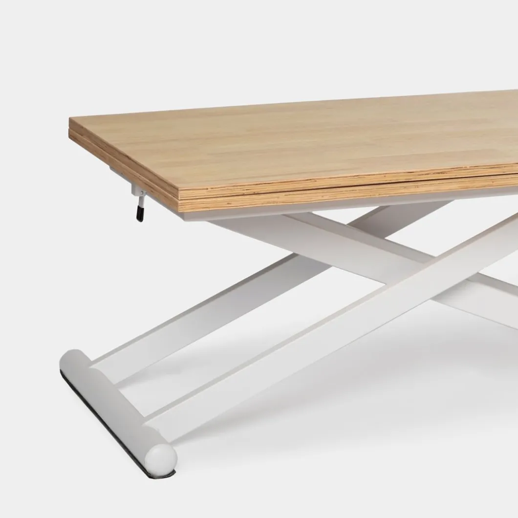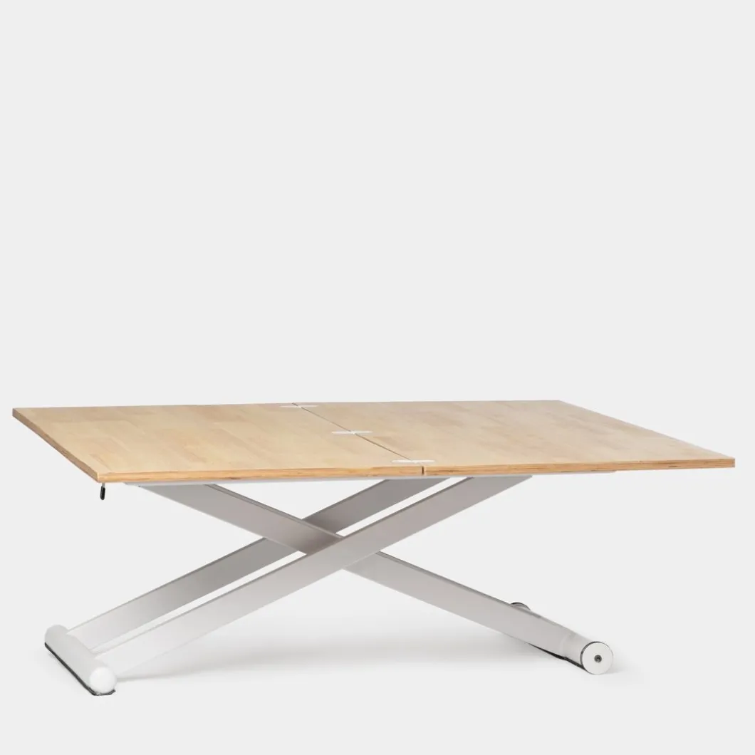 Aprovecha al máximo el espacio de tu hogar con la mesa de centro elevable y extensible Tapi. Su estructura metálica permite elevarla a la altura de una mesa de comedor, mientras que su tapa de madera de roble extensible tipo libro te brinda el espacio adicional que tanto necesitas. Esta mesa multiposición es ideal como mesa de centro, mesa de comedor, o incluso escritorio.