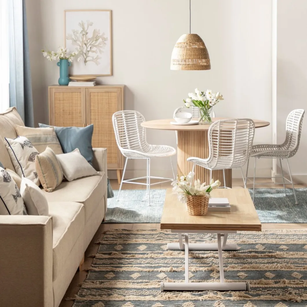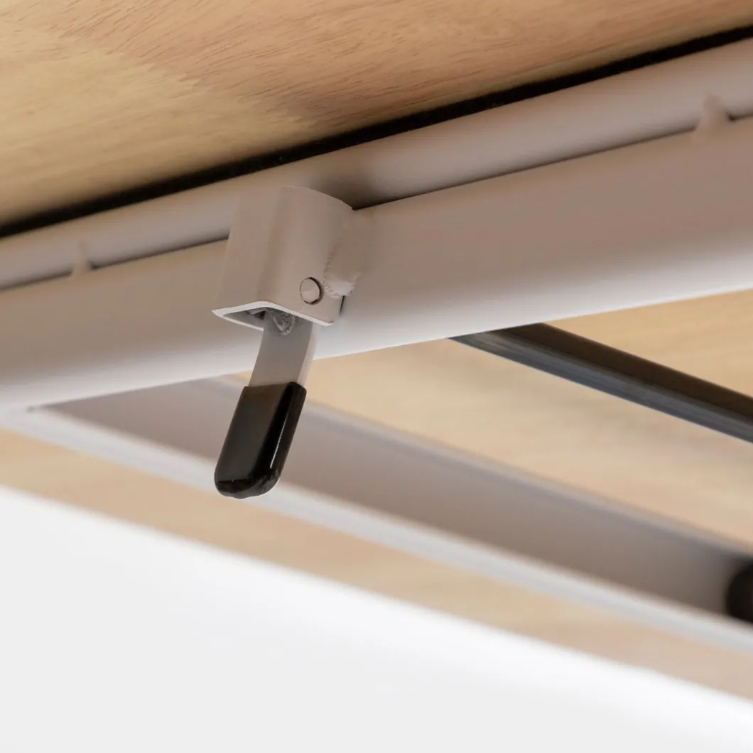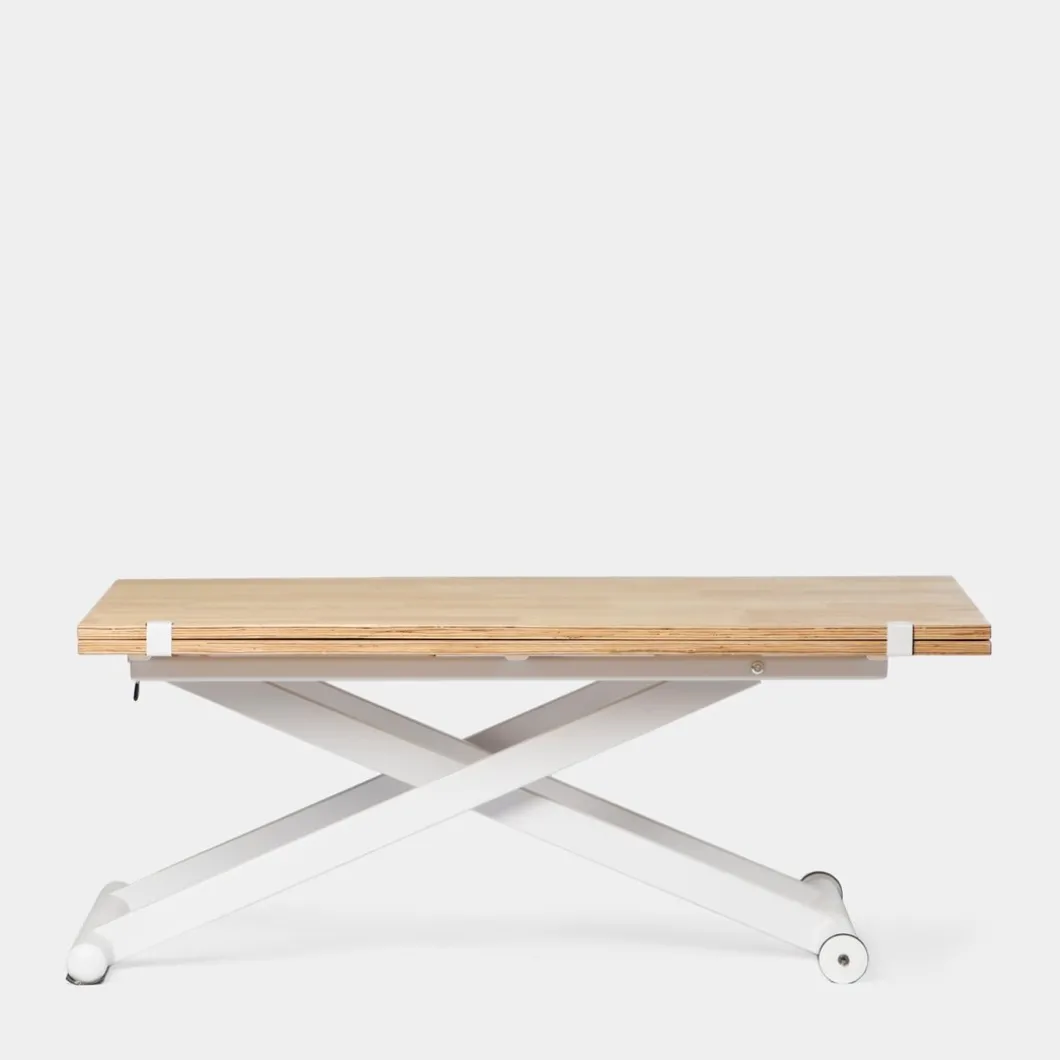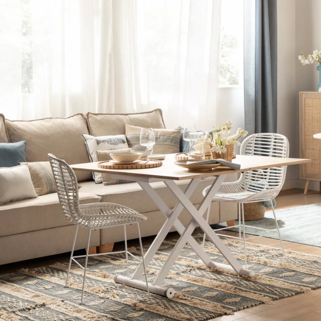 Aprovecha al máximo el espacio de tu hogar con la mesa de centro elevable y extensible Tapi. Su estructura metálica permite elevarla a la altura de una mesa de comedor, mientras que su tapa de madera de roble extensible tipo libro te brinda el espacio adicional que tanto necesitas. Esta mesa multiposición es ideal como mesa de centro, mesa de comedor, o incluso escritorio.