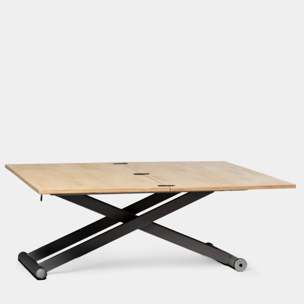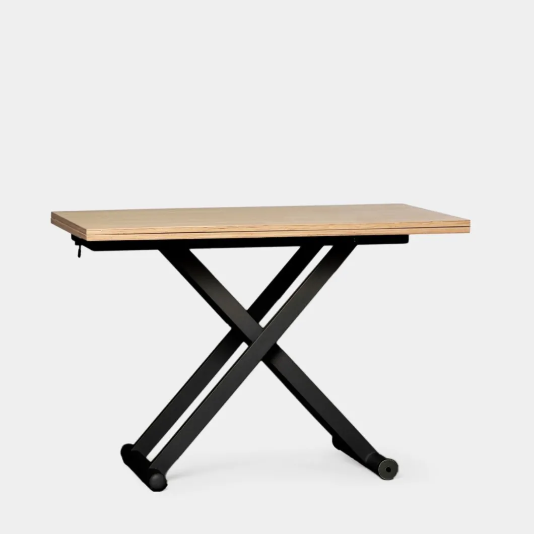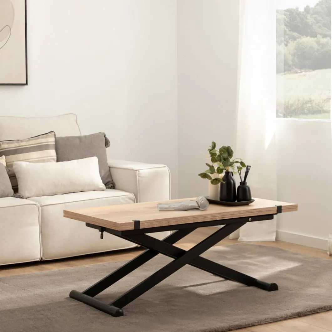 Aprovecha al máximo el espacio de tu hogar con la mesa de centro elevable y extensible Tapi. Su estructura metálica permite elevarla a la altura de una mesa de comedor, mientras que su tapa de madera de roble extensible tipo libro te brinda el espacio adicional que tanto necesitas. Esta mesa multiposición es ideal como mesa de centro, mesa de comedor, o incluso escritorio.
