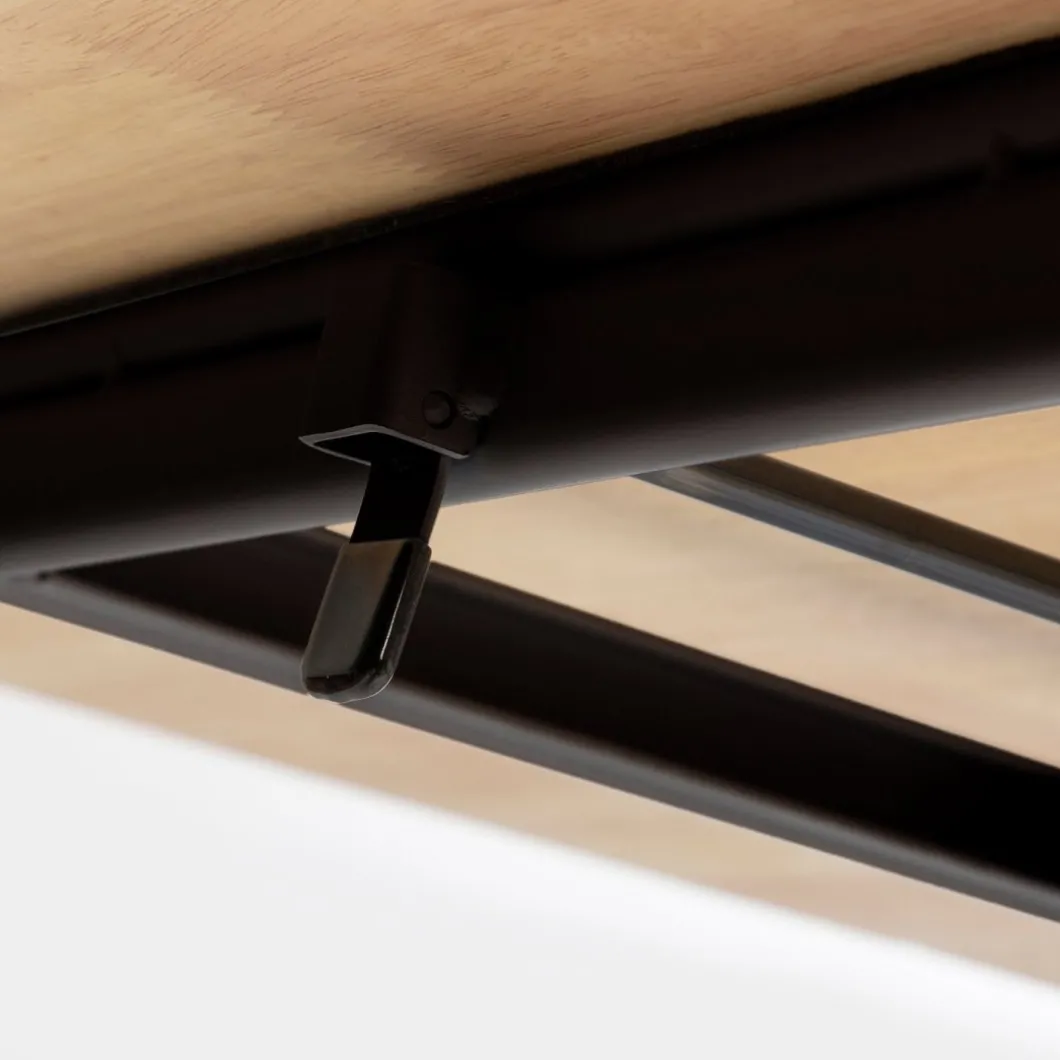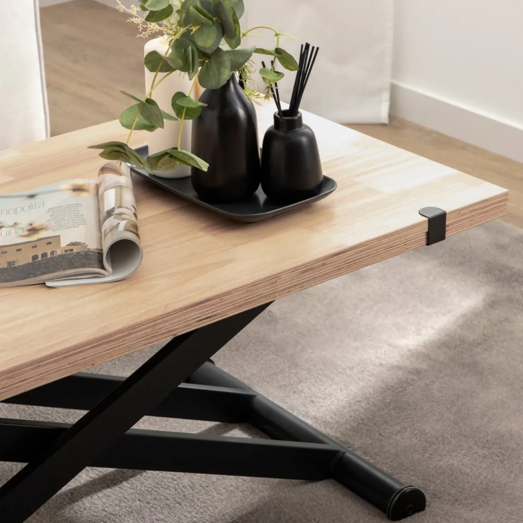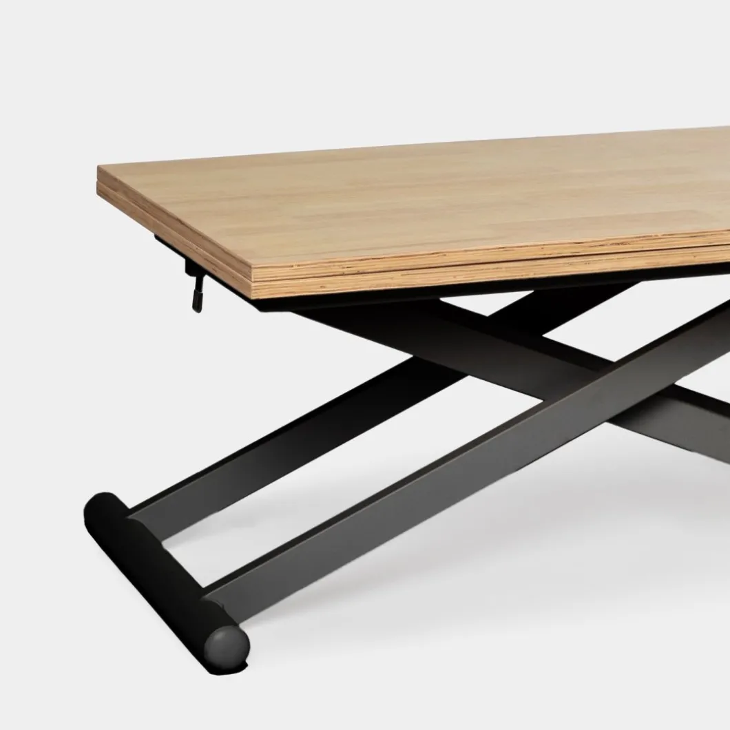 Aprovecha al máximo el espacio de tu hogar con la mesa de centro elevable y extensible Tapi. Su estructura metálica permite elevarla a la altura de una mesa de comedor, mientras que su tapa de madera de roble extensible tipo libro te brinda el espacio adicional que tanto necesitas. Esta mesa multiposición es ideal como mesa de centro, mesa de comedor, o incluso escritorio.