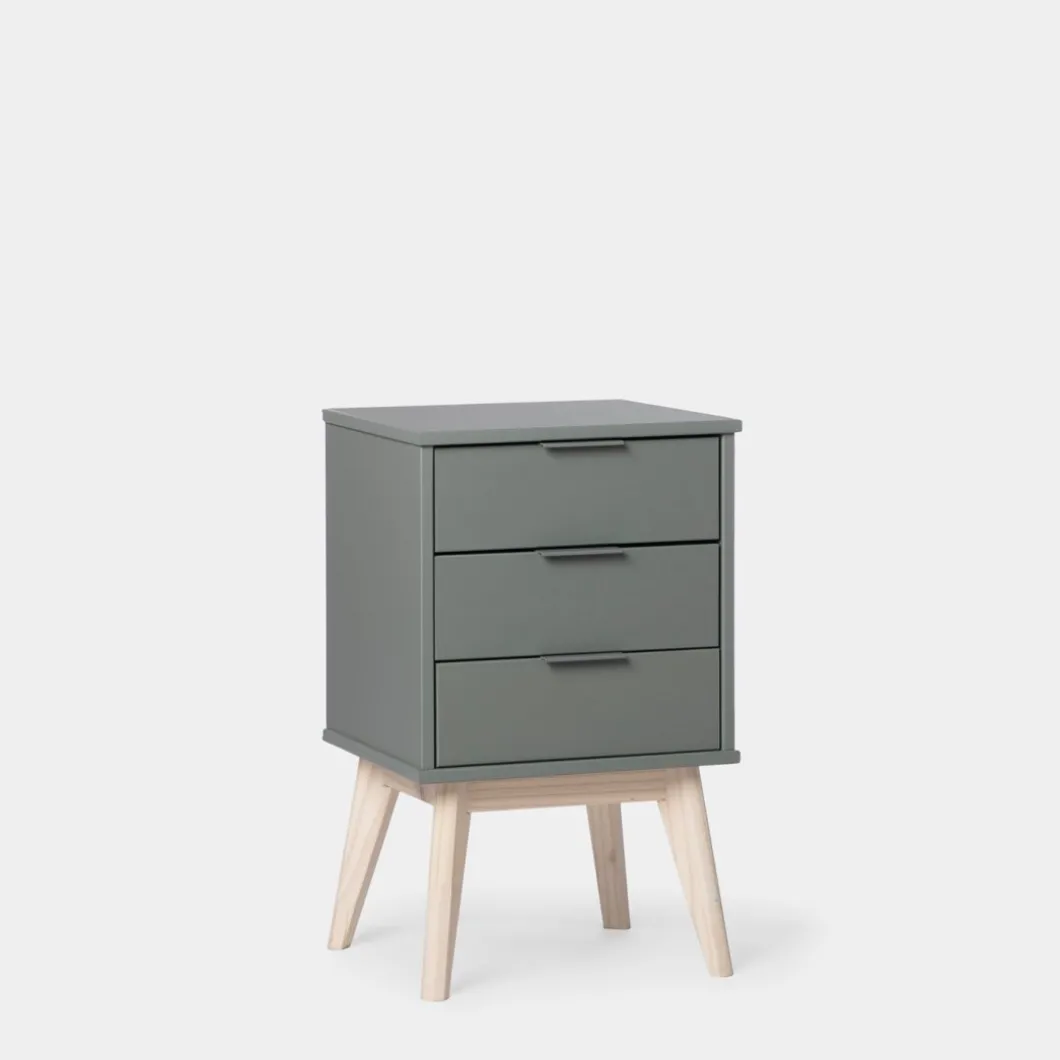 La mesita de noche lacada en verde antracita Troy de 3 cajones y patas en madera de pino natural es perfecta para conseguir almacenaje extra y mantener tu dormitorio limpio y ordenado. Gracias a su diseño sencillo y atemporal encaja en cualquier estilo decorativo.
