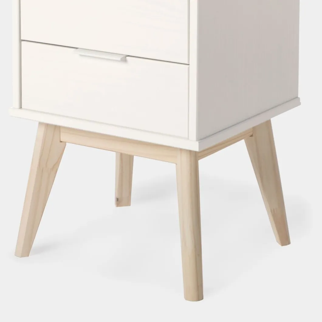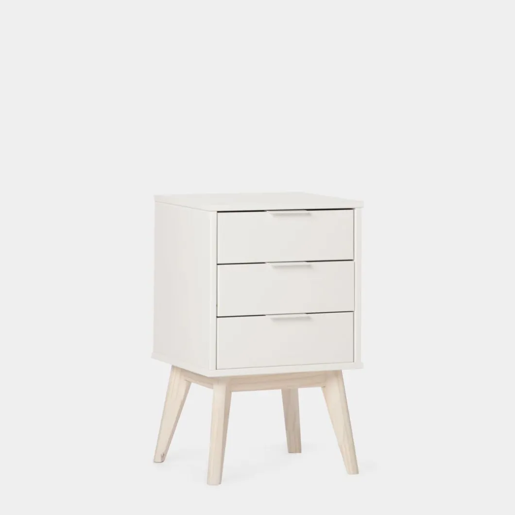 La mesita de noche lacada en blanco Troy de 3 cajones y patas en madera de pino natural es perfecta para conseguir almacenaje extra y mantener tu dormitorio limpio y ordenado. Gracias a su diseño sencillo y atemporal encaja en cualquier estilo decorativo.