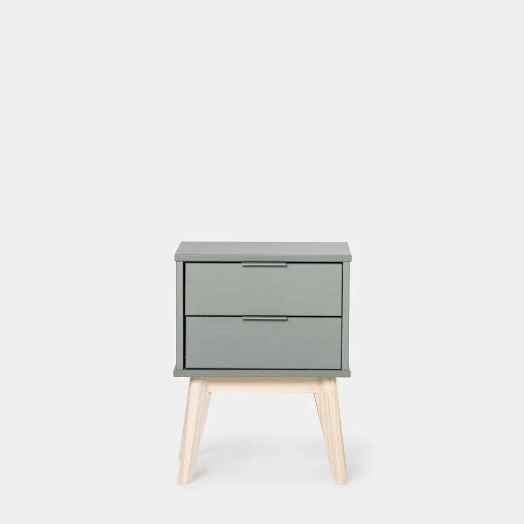 La mesita de noche Troy lacada en verde antracita con patas en madera maciza es perfecta para conseguir almacenaje extra y mantener tu dormitorio limpio y ordenado. Gracias a su diseño sencillo y atemporal puede encajar con cualquier estilo decorativo. También está disponible en blanco, escoge el acabado que más te guste.