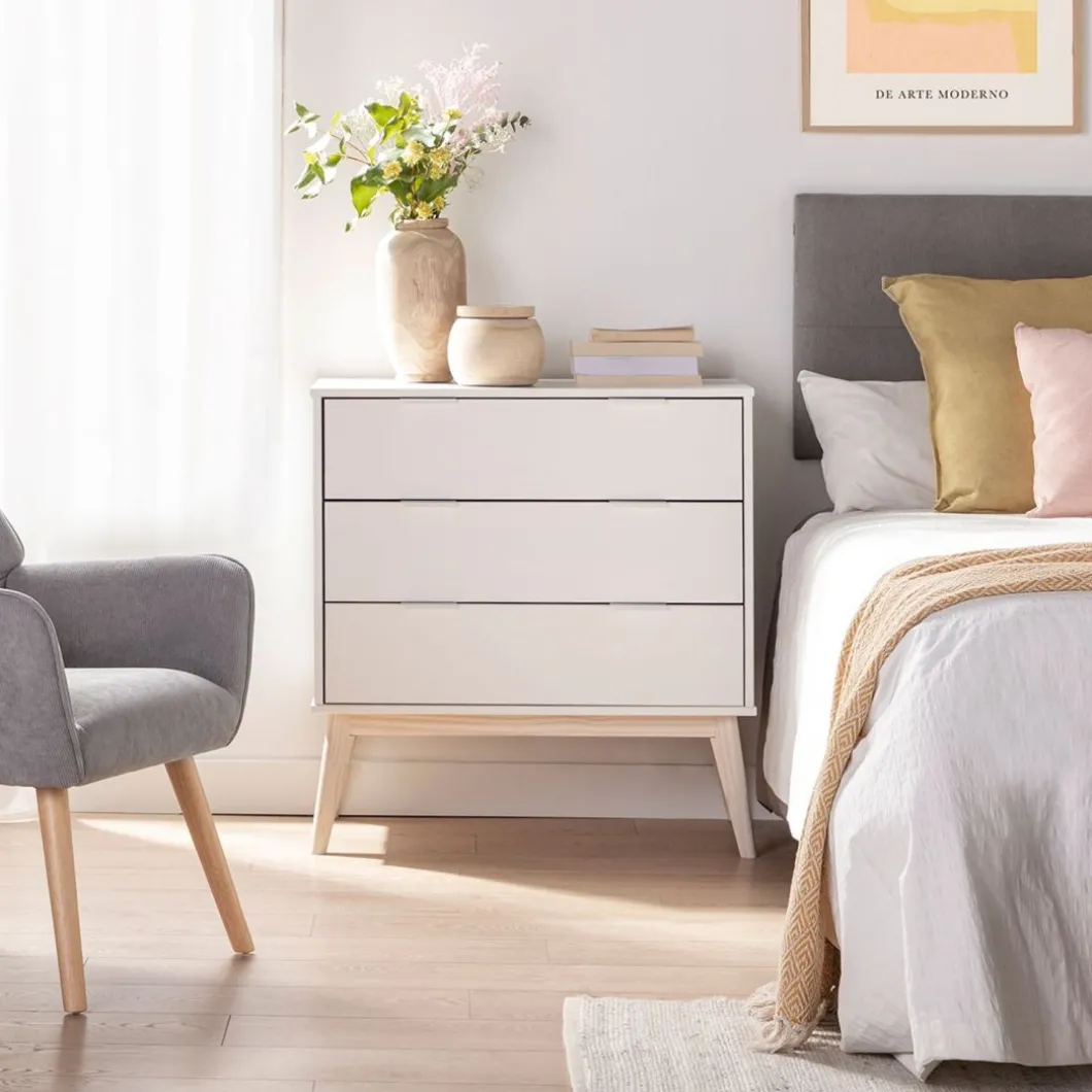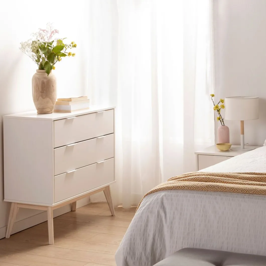 Con la cómoda Troy lacada en blanco conseguirás un extra de almacenaje que te ayudará a mantener el orden en casa. Cuenta con tres cajones de gran capacidad en los que podrás almacenar todo aquello que no necesites tener a la vista. Para mayor estabilidad del mueble, aconsejamos su anclaje a la pared.
